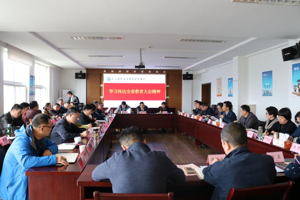 3月25日,学校党委召开专题会议,传达学习全省教育大会精神。党委书记陈松华介绍了大会概况,传达了会议主要精神和车俊书记重要讲话精神。全省教育大会对未来全省教育事业发展作出了战略部署,描绘了新时代浙江教育发展的新蓝图,开启了高水平建设高等教育强省的新征程,充分彰显了省委省政府立德树人、强基固本、决胜未来的坚定信心。大会的召开,特别是省委车俊书记在大会上的重要讲话,既是习近平总书记关于教育工作重要论述的再宣讲、再学习,也是全面贯彻党的教育方针,率先高水平实现教育现代化的总动员、总部署。陈松华书记强调,要高度重视、深入学习、认真贯彻会议精神。把学习贯彻全省教育大会精神,同学习习近平新时代中国特色社会主义思想、关于教育的重要论述精神、关于思想政治理论课的重要讲话精神,同高校党的建设工作会议精神结合起来,全面加强党的领导,树牢“四个意识”,坚定“四个自信”,坚决做到“两个维护”,始终坚持立德树人根本任务,着力培养德智体美劳全面发展的社会主义建设者和接班人。以高度的政治责任感和强烈的党性意识,切实抓好学习贯彻落实,把思想和行动统一到全力推进学校新时代高质量发展上来,确保党中央和省委决策部署落地生根、取得实效。