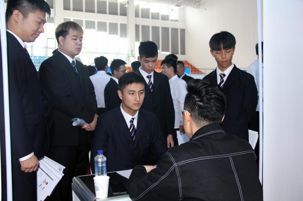 上午9时,学校体育馆内人流如织。来招聘的80多家企业一字排开,排成6列。每家摊位前都布置了展架,上面写着单位介绍、招聘岗位、招聘人数、薪资待遇等。各企业的工作人员认真向同学们介绍企业基本情况、岗位情况、薪资待遇和晋升制度等,同学们也就各方面情况向企业进行了咨询。