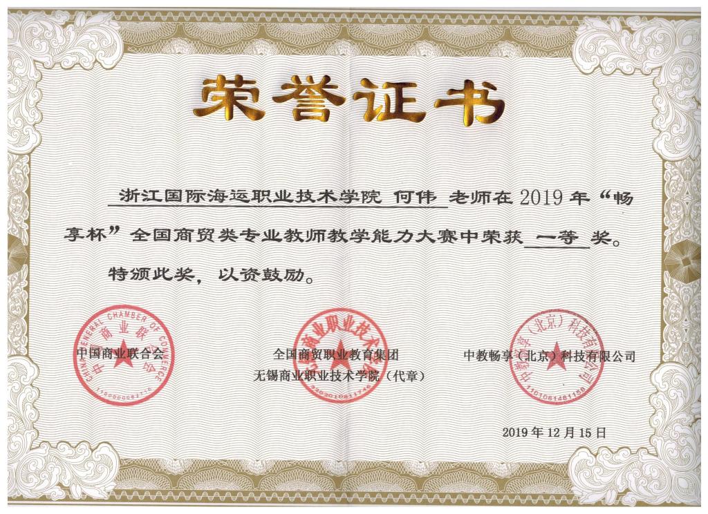 由中国商业联合会、全国商贸职业教育集团和中教畅享(北京)科技有限公司共同主办的 2019 年“畅享杯”全国商贸类专业教师教学能力大赛于12月15日圆满结束。港口管理学院何伟老师从来自全国24个省市(自治区)145所院校的203名参赛教师中脱颖而出,荣获一等奖。