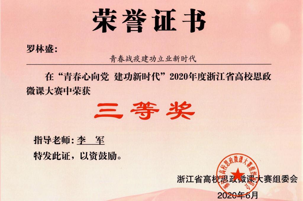 近日,校团委选送的《青春在战“疫”中闪光-——致敬90后、95后战“疫”英雄》 和《青春战疫建功立业新时代》两件作品分别在2020年度浙江省高校思政微课大赛中荣获教师组二等奖和学生组三等奖。本次大赛由团省委、省教育厅、省学联联合组织举办,校团委从5月开始广泛动员全校6个二级学院学生和青年教师参与,经过校内选拔,最终确定了3件教师组作品和2件学生组作品参加省赛,涵盖了服务奉献类、理想信念类、疫情防控类3个类别。