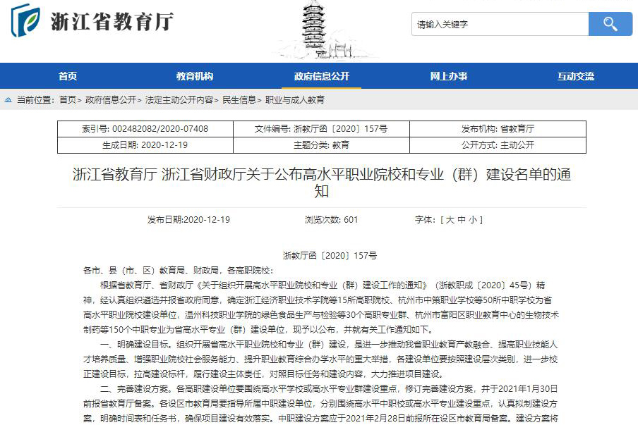 浙江省高水平职业院校和专业(群)建设工作是我省深入贯彻《国家职业教育改革实施方案》《职业教育提质培优行动计划(2020—2023)》的具体行动,也是进一步推动职业教育产教融合、提高职业技能人才培养质量、增强职业院校社会服务能力、提升职业教育综合办学水平的重大举措。