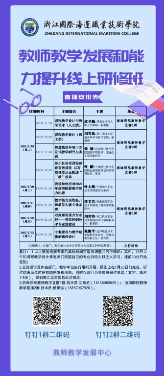 截止1月19日,全校共有306人加入浙海职院教师教学直播1群,共有191人加入了浙海职院教师教学直播2群。4位专家极具个人魅力的讲座给老师们留下了深刻印象。参加研修的部分老师表示,线上研修适应新形势、效果好,通过线上直播形式,能够破除距离障碍,聆听高水平课程,开拓视野,收获颇丰。(教务处)