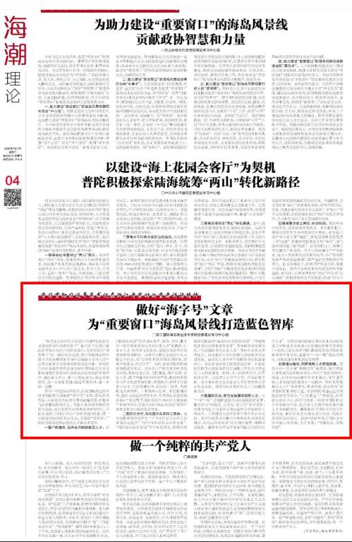 7月,学校党委理论中心组署名文章《做好“海字号”文章为“重要窗口”海岛风景线打造蓝色智库》发表在《舟山日报》理论文章版面。