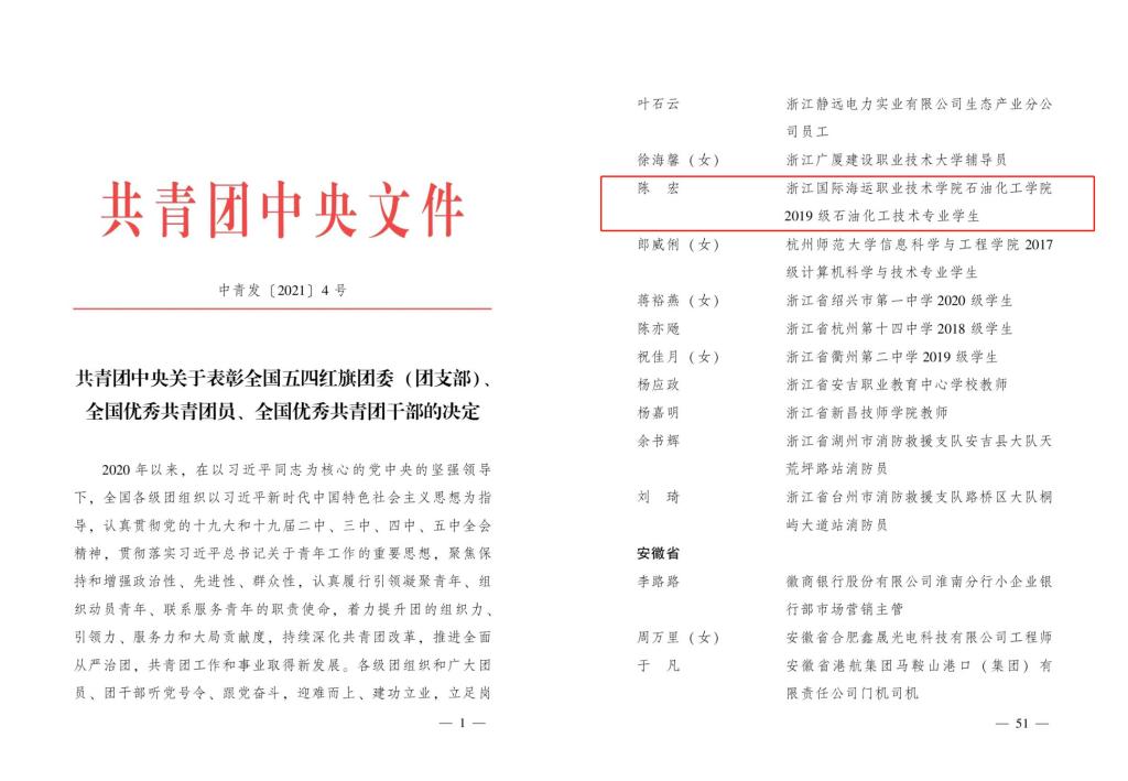 今年五四青年节前夕,共青团中央对荣获第25届“中国青年五四奖章”及全国五四红旗团委(团支部)、全国优秀共青团员、全国优秀共青团干部的个人和集体予以表彰。我校石油化工学院2019级石油化工技术专业陈宏同学获评“全国优秀共青团员”荣誉称号,全省仅2名大学生获此殊荣。