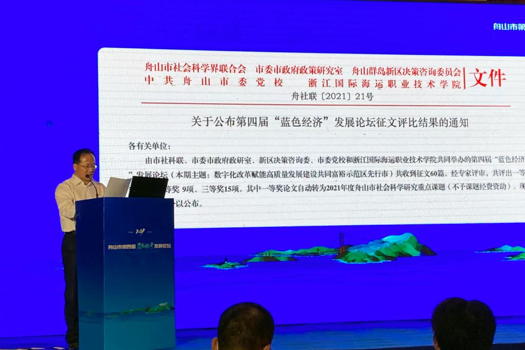 论坛上,舟山市社科联副主席、我校党委副书记孔志光宣读了《舟山市第四届”蓝色经济”发展论坛征文评比结果的通知》,同时宣布其中一等奖论文自动转为2021年度舟山市社会科学研究重点课题。