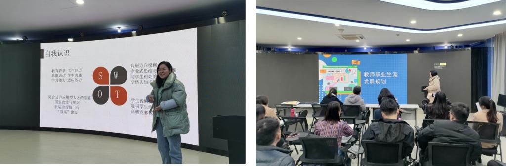 在随后的职业生涯规划交流环节,航海工程学院的倪菁韡和陈日鑫、海洋装备工程学院于朋涛、国际教育学院陈星蓉、石油化工学院戎泽、马克思主义学院胡诚豪等6组教师代表分别就自我认知、岗位认知、未来几年发展定位目标、如何落实个人发展计划等职业生涯规划内容做了汇报交流。教师代表思想站位高、自我分析透彻、发展目标明确、实施举措得力,汇报内容得到了校外专家和各位领导的充分肯定。