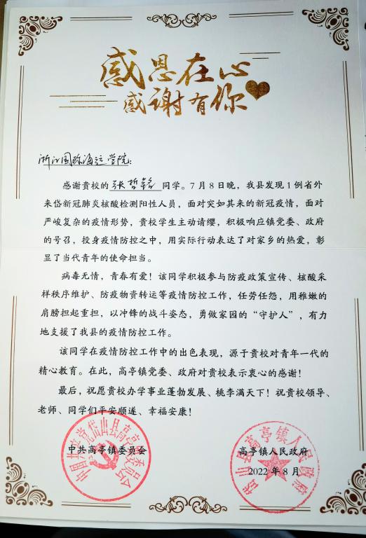近日,海洋装备工程学院收到了一封来自舟山市岱山县高亭镇人民政府的感谢信,信中对学院2021级港口机械与智能控制2班张哲铭同学在今年78日岱山抗击新冠疫情期间,主动请缨、不惧危难、迎难而上的担当行为表示感谢。