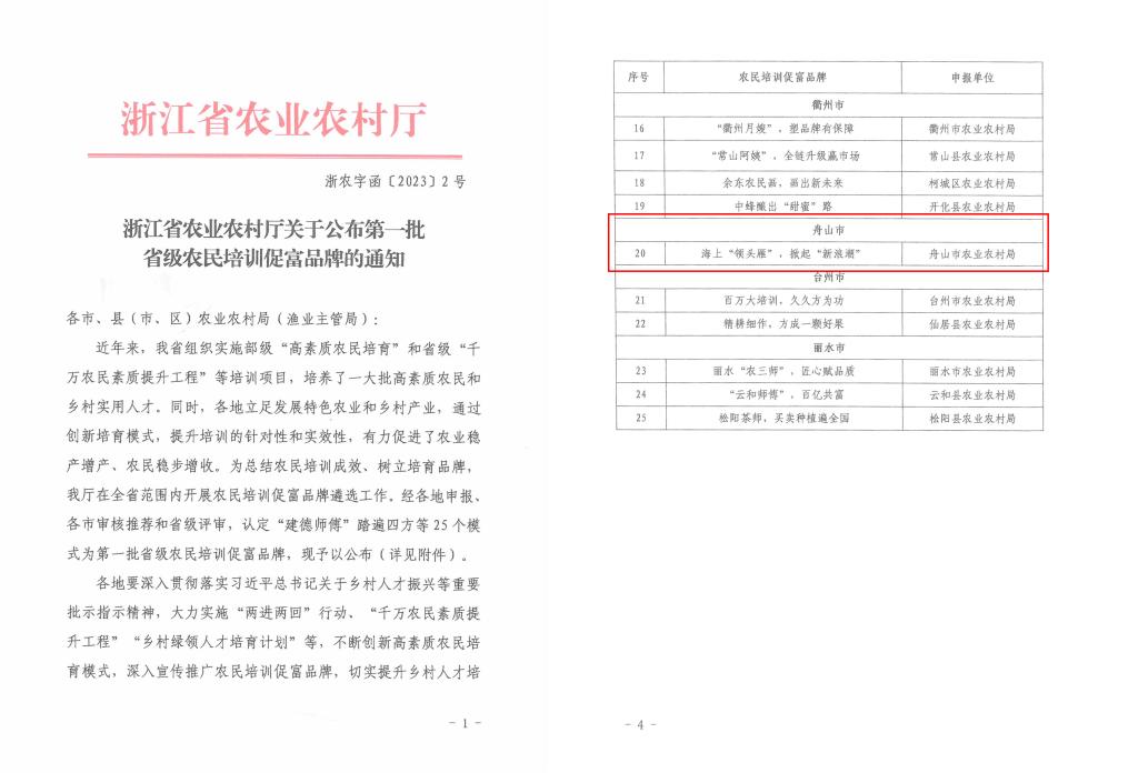 近日,从浙江省农业农村厅获悉,由舟山市乡村振兴学院承办的2022年村党组织书记学习贯彻省第十五次党代会精神暨建设海岛共富样板专题轮训项目被评定为“第一批省级农民培训促富品牌”。