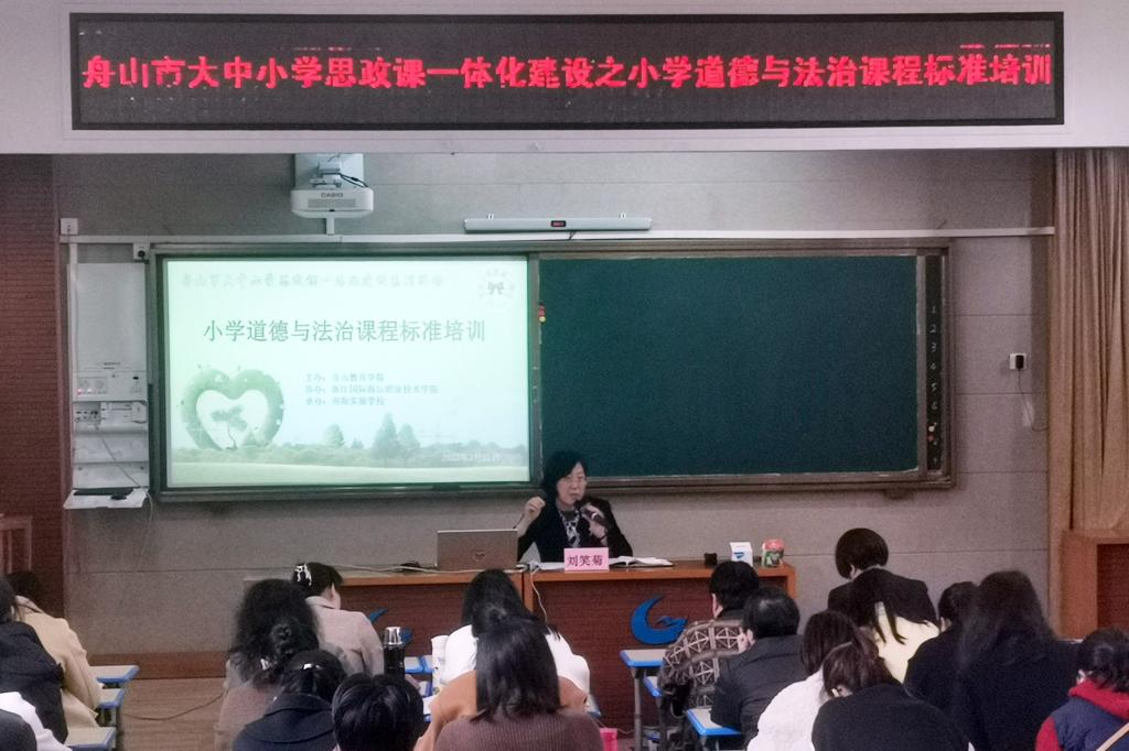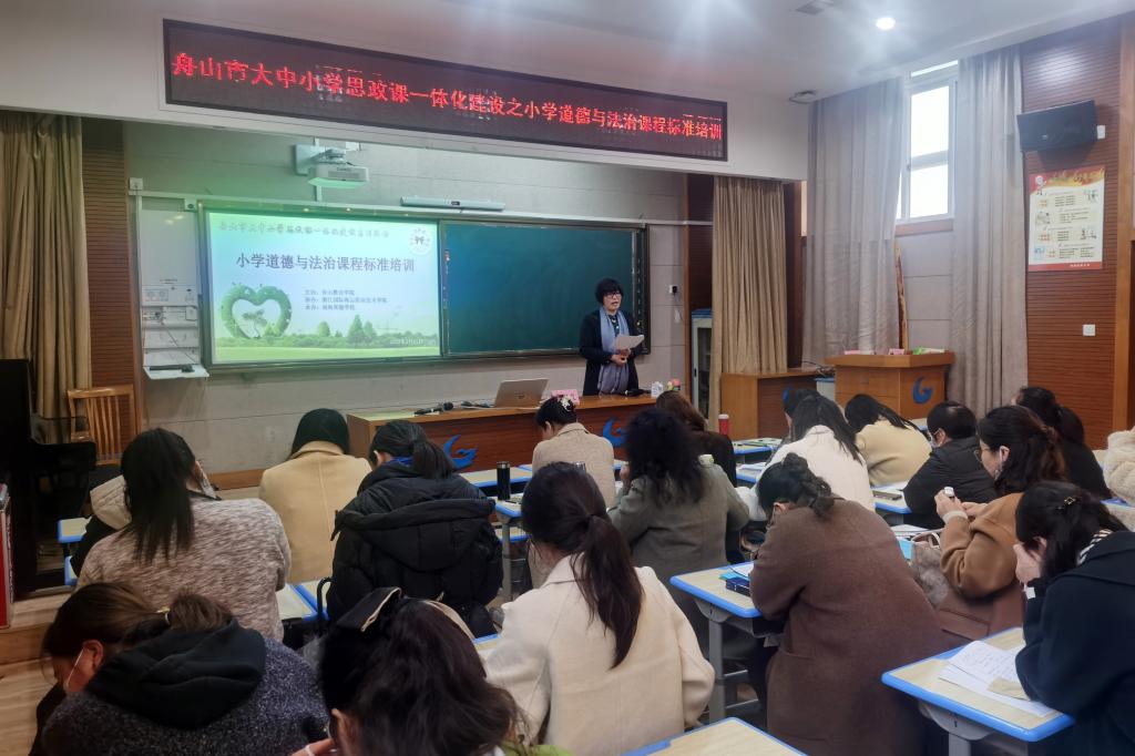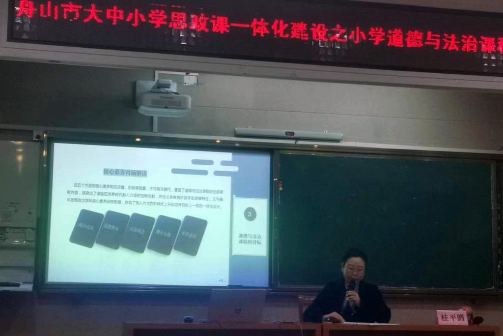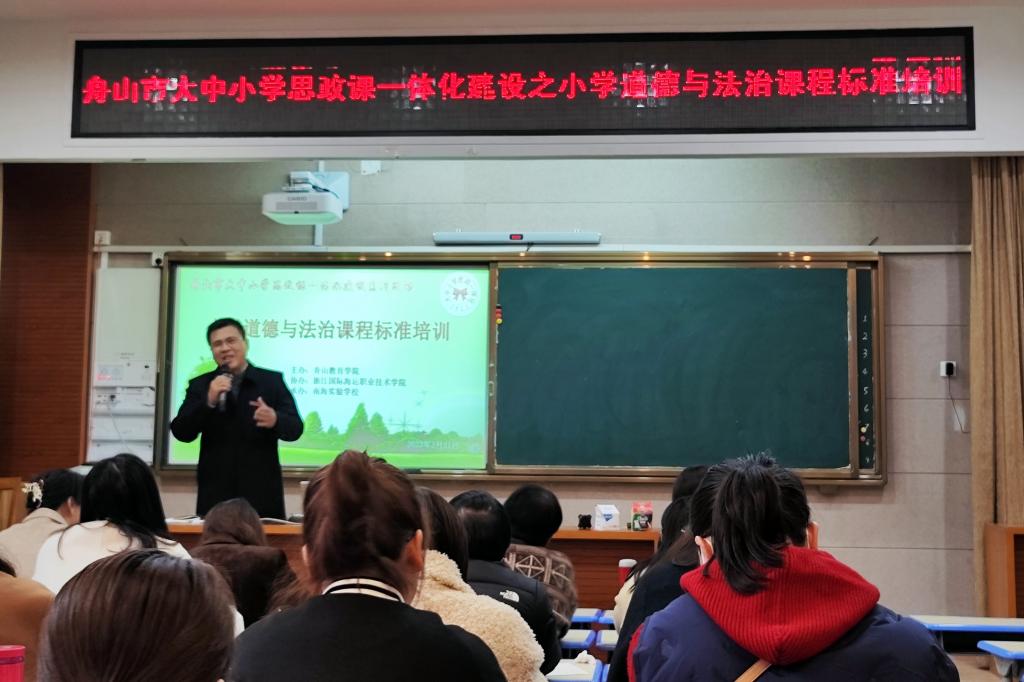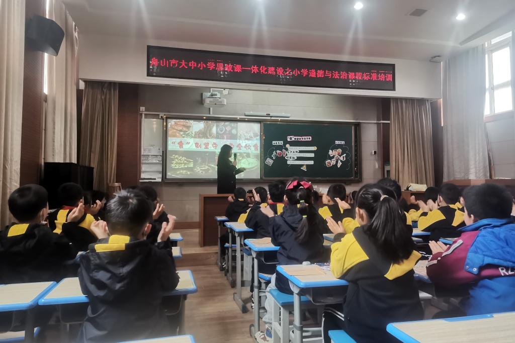 在这场由舟山市大中小学思政课一体化联盟单位南海实验学校承办的研学活动中,南海实验小学惠佳老师执导的《我参与,我奉献》,舟山第二小学的徐静璇老师执导的《“食”刻坚守,安全饮食》,紧扣新时代热点,把握正能量支点,达到了预期效果。这是舟山市春季开学以来第一场“手拉手”大中小学思政课一体化研学活动。同日上午,南海实验学校的桂平圆老师、舟山二小的戚艳娜老师以2022版义务教育道德与法治课程标准的解读为主话题,对课程性质、目标、理念、课程内容、教学建议、学业评价等进行了全面、深刻、细致的解读,舟山市属小学的30余位思政课教师参加了为期一天的研学,学校马克思主义学院思政课一体化集体备课中心5位专家和思政教师应邀到场观摩指导。