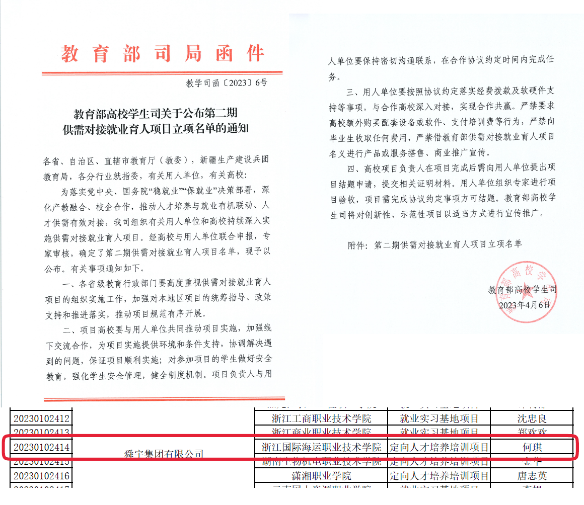 4月6日,教育部高校学生司公布第二期供需对接就业育人项目立项名单,我校海洋装备工程学院联合舜宇集团有限公司申报的《以就业育人为导向的产教融合现代学徒制“舜宇班”》定向人才培养培训项目入选。