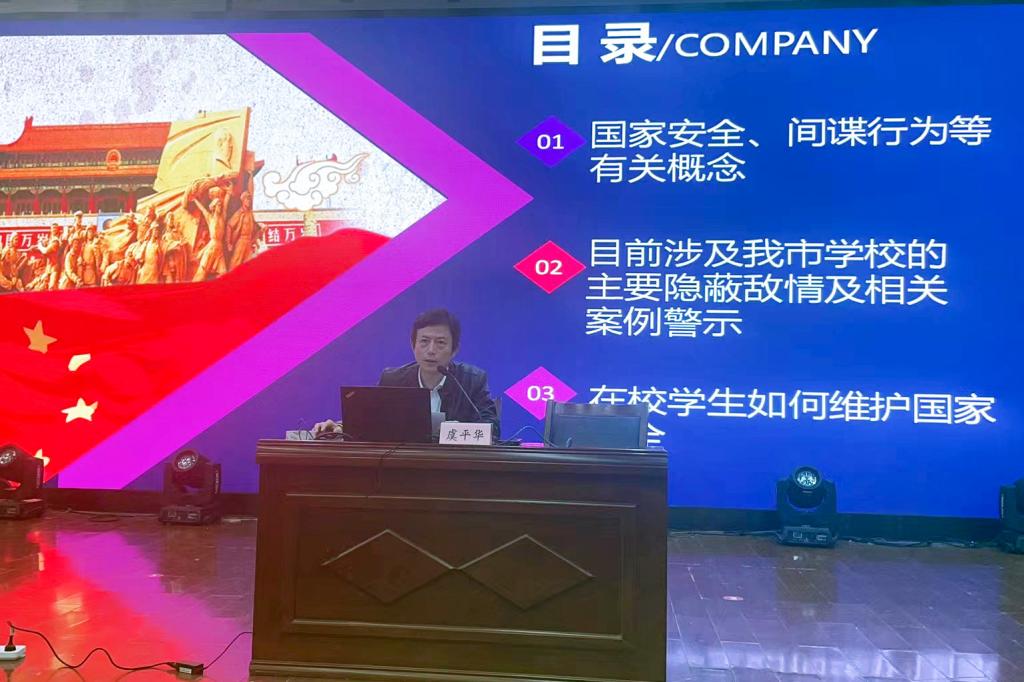 4月12日,学校邀请了舟山市定海区政法委副书记虞平华为全校师生讲授国家安全知识。副书记介绍了《国家安全法》《反间谍法》、近十年来舟山地区高校学生涉及隐蔽敌情案例分析以及在校学生如何维护国家安全等方面的内容,并结合工作经验,重点讲解了大学生面对危害国家安全行为如何善于斗争、敢于斗争,告诫学生要时刻绷紧国家安全这根弦,以高度的自觉性维护国家安全和社会的和谐稳定。