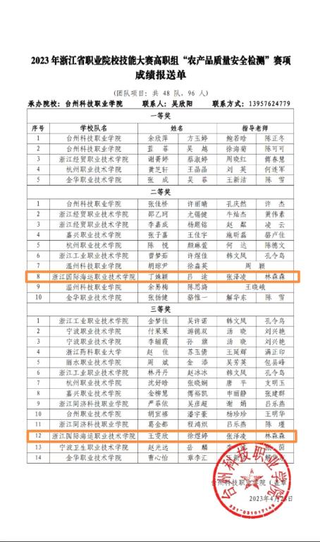 4月26日-28日,由浙江省教育厅主办的2023年浙江省职业院校技能大赛高职组“农产品质量安全检测”赛项在台州科技职业学院举办。海洋旅游学院食品专业张泽凌、林森森老师带领食品检验检测技术专业吕途、丁姝颖、徐煜婷、王雯欣、鲍慧文、郑淑遥等6位同学参加了比赛。经过激烈比拼后,获得团体二等奖和团体三等奖,这是我校首次在该赛项中获奖。