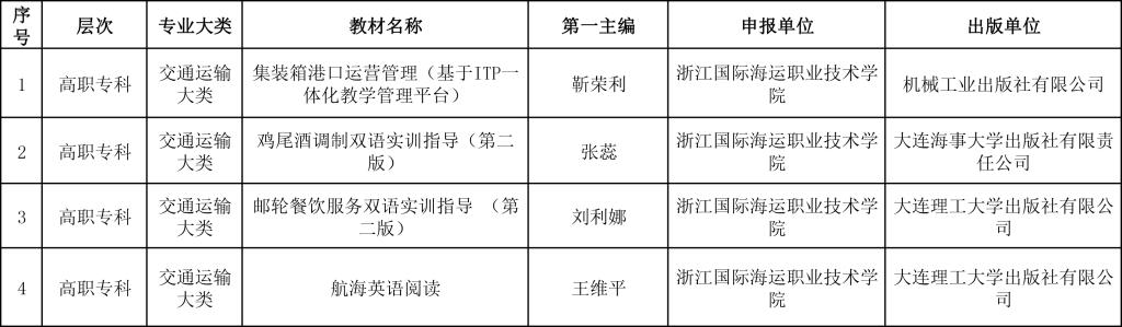 另外,还有3部副主编教材入选,分别是《新编高职高专体育教程》(孙磊)、《海上货物运输》(汪益兵)、《网店运营实训》(何伟)。