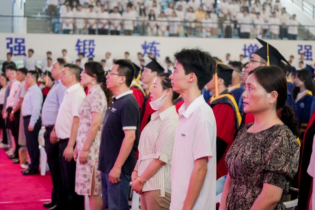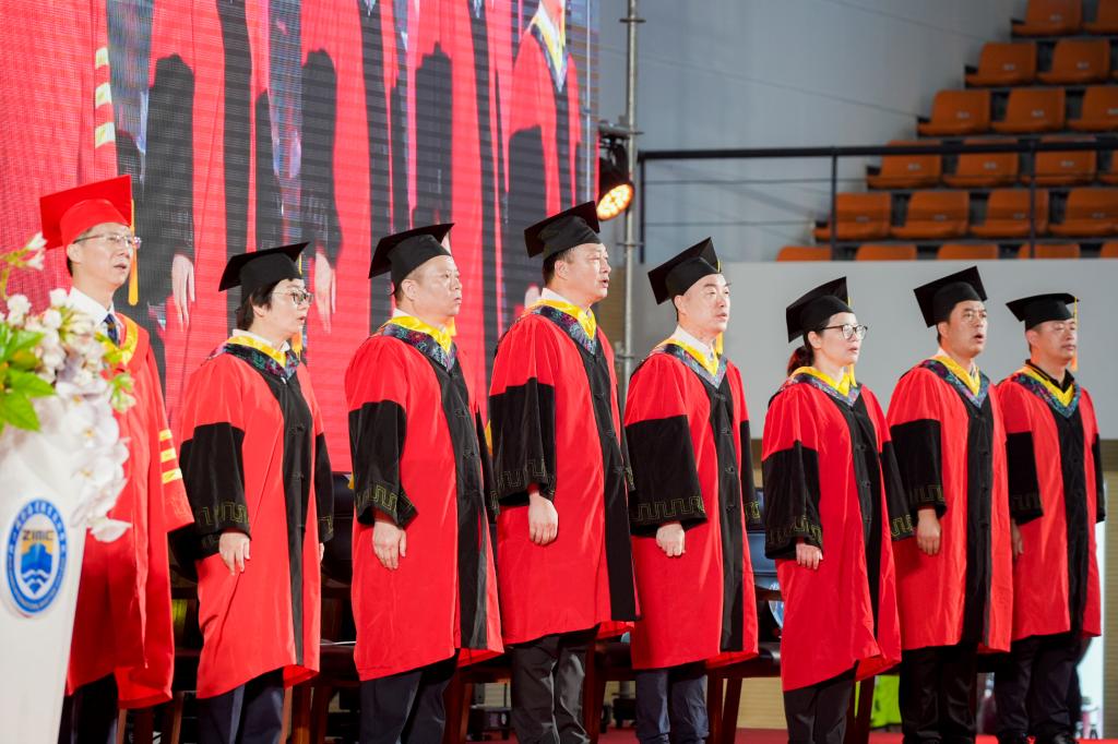 在嘹亮的国歌声中,毕业典礼拉开了帷幕,全场庄严肃立,奏唱国歌。