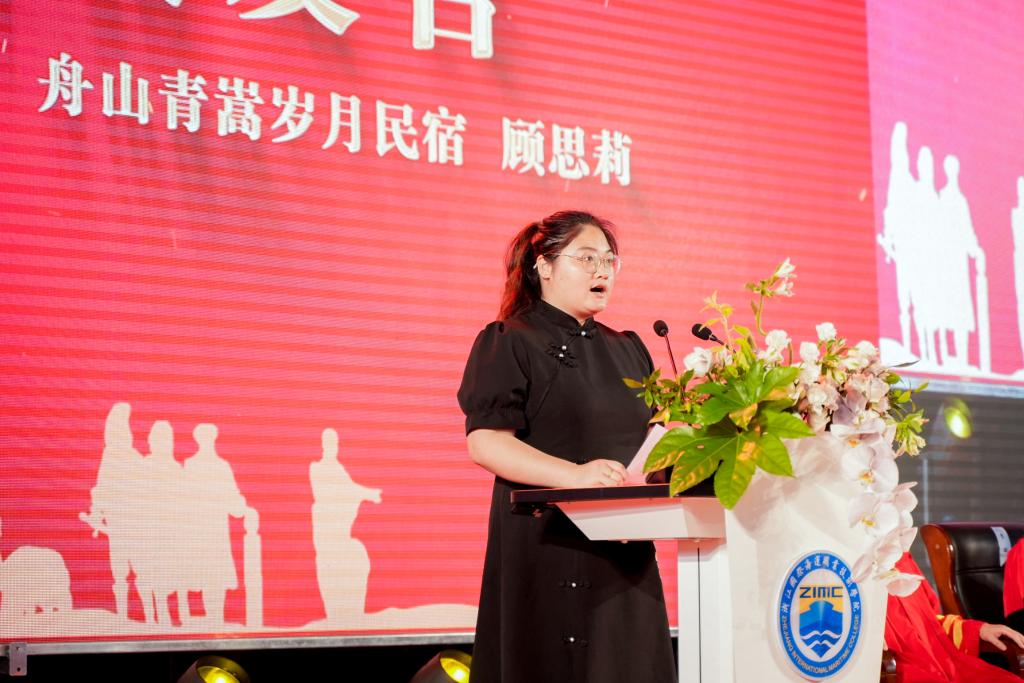 海洋旅游学院2018届毕业生舟山青嵩岁月民宿负责人顾思莉作为校友代表向毕业生们表示了祝贺,她分享了自己的创业奋斗历程,鼓励毕业生心怀梦想,一起成为母校的骄傲!