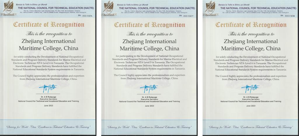 2023年6月,由我校主持、参与的坦桑尼亚职业标准和配套专业教学标准轮机工程技术员4级、轮机工程技术员6级、船舶电子电气技术员4级、船舶电子电气技术员5级、船舶电子电气员6级、石油化工产品技术员4级等6个项目获得坦桑尼亚国家教育委员会认证,正式纳入坦桑尼亚国家职业教育体系。
