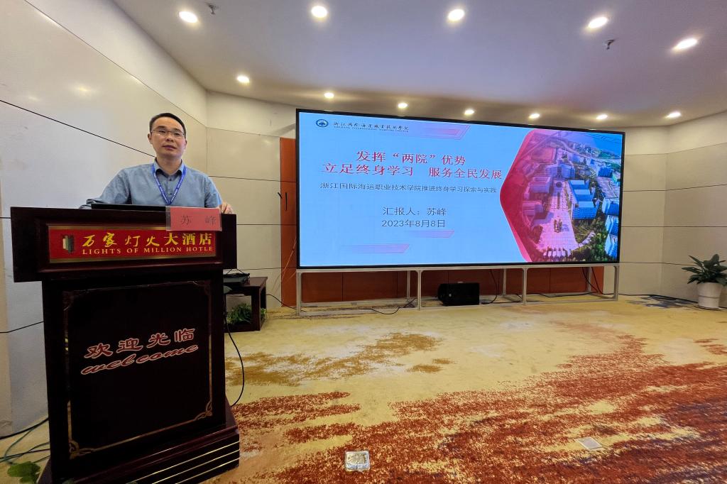 分享会上,苏峰从学校与舟山市乡村振兴学院等“两院”概况入手,详细表述了自2022年6月我校成功获批“职业院校服务全民终身学习项目”第一批实验校以来,在职业培训与继续教育方面开展的做法与取得实效,并从坚持党建引领,把支部建在社会培训上;重视全民终身学习工作,加强顶层设计;理顺体制机制,提升管理效能;盘活平台资源,搞好协调配合;打造优质品牌,提升社会影响力;优化调整科研平台,大力提倡终身教育研究等六个做法,服务人数不断增加、服务项目不断丰富、服务质量不断提高、政校企合作不断加深、基地荣誉不断增多等五个成就方面进行了详细阐述。