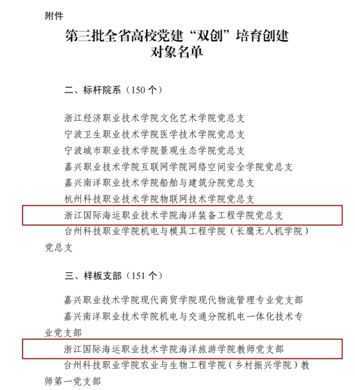 近日,浙江省委教育工委办公室公布第三批全省高校党建“双创”培育创建对象名单,确定10个示范高校、150个标杆院系、151个样板支部等为本批次培育创建对象。我校海洋装备工程学院党总支入选“标杆院系”培育创建单位,海洋旅游学院教师党支部入选“样板支部”培育创建单位。