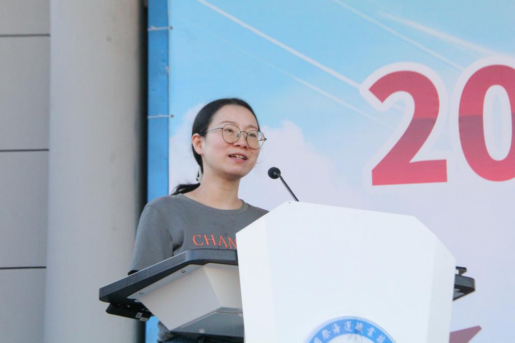 海洋旅游学院胡赛儿老师代表学校全体教师表达了欢迎同学们的心声,她勉励所有新生明确规划目标、学好知识和技能、合理安排时间,修得“坚毅心”“自愈心”“平常心”,在大学期间塑造自己,实现梦想。