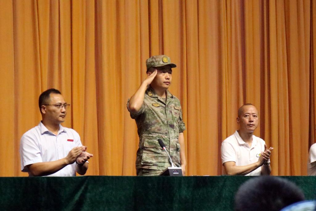 承训部队首长陈明在讲话中阐述了军训的重要性和意义,也对同学们接下来14天的军训提出了明确的要求,他希望同学们以饱满的精神,昂扬的斗志参加训练,用实际行动来证明“强国有我”的决心和勇气。