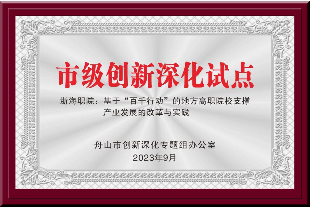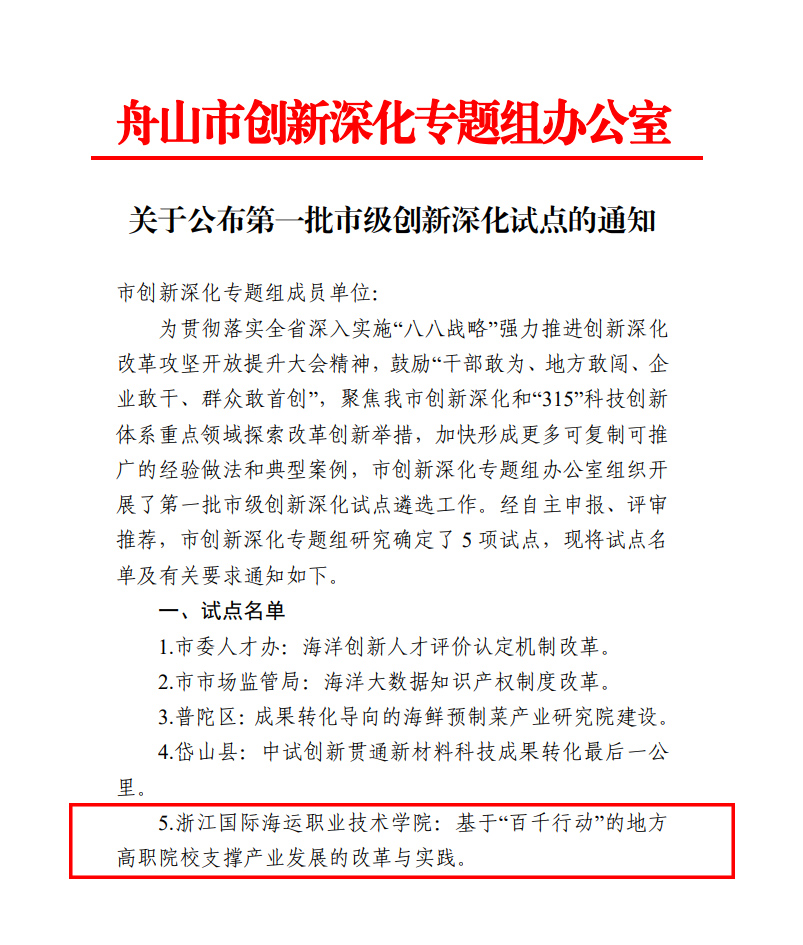 为贯彻落实全省深入实施“八八战略”强力推进创新深化改革攻坚开放提升大会精神,聚焦我市创新深化和315科技创新体系重点领域改革创新新举措,加快形成可复制可推广的典型案例和经验做法,舟山市组织开展了第一批创新深化试点遴选工作,全市共有12家单位参与申报。经评选,5家单位的创新深化项目入选首批市级创新深化试点,我校《基于“百千行动”的地方高职院校支撑产业发展的改革与实践》列入其中。