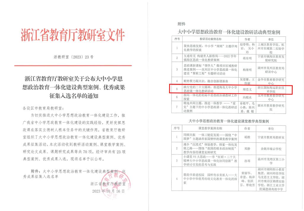 10月16日,浙江省教育厅教研室公布浙江省大中小学思想政治教育一体化建设典型案例、优秀成果征集入选名单,我校马克思主义学院郑忠义老师撰写的关于舟山市举行大中小学思政课一体化集体研学活动的《践行党的二十大精神,推进海岛大中小学思政课一体化教研活动》成功入选。