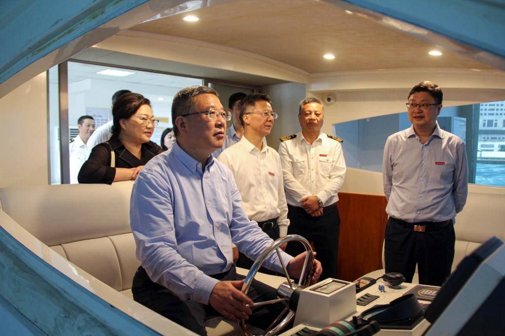 张明超一行参观了学校航海模拟器、游艇模拟器、轮机模拟器、国家级航海虚拟仿真中心、全国舰船科普教育基地船舶知识馆、省教育系统廉洁教育基地东海阁等,深入了解我校的办学条件、实习实训、人才培养和内涵建设等方面工作开展情况。