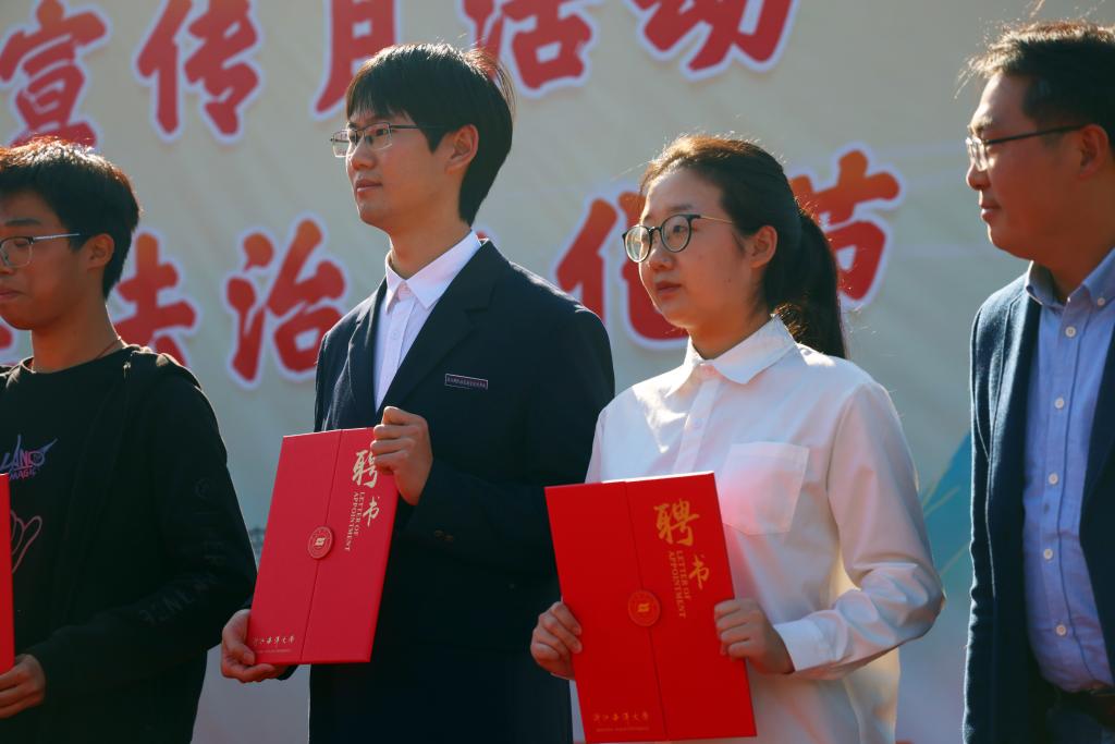 在舟山市首届大学法治文化节上,成立了舟山“法治文化宣演团”,我校林伊涵、罗晨元成为该文化宣演团第一批普法骨干力量。该团队接下来将创作、编排系列“青力”主题普法短剧、普法歌曲、普法诵读等作品,挖掘、宣讲系列海洋特色法治故事和案例,为高水平法治舟山建设贡献海运学子的青春力量。