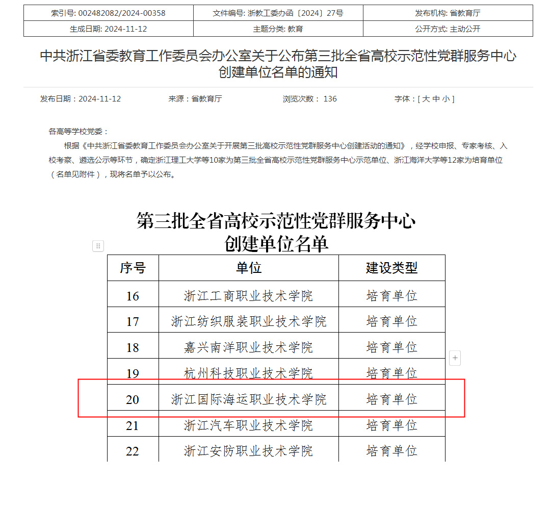 近日,中共浙江省委教育工作委员会办公室公布第三批全省高校示范性党群服务中心培育单位名单。经学校申报、专家审核、公示等环节,我校成功入选培育单位名单。