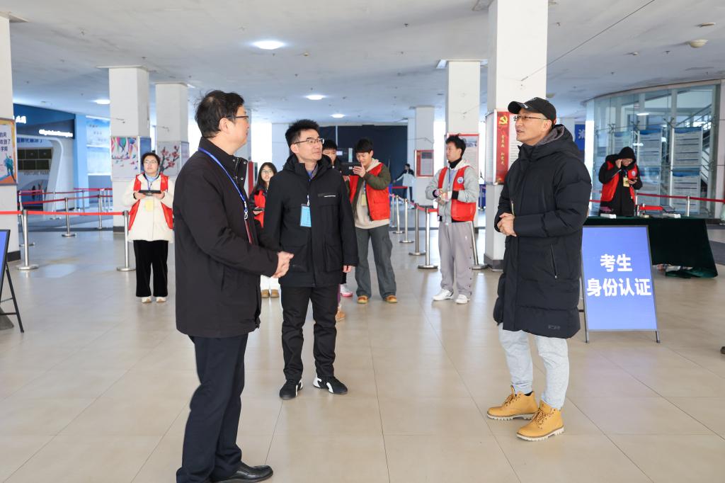 12月20日下午,校党委书记苏为泽、党委副书记孔志光,副校长李丽、曹志斌带领相关部门负责人到图书馆一楼集中安检区、考场区以及视频监控中心等相关场所检查指导考务准备工作,要求提高政治站位,提高服务意识,落实安全稳定责任,力争高质量、高标准完成研考考务工作。