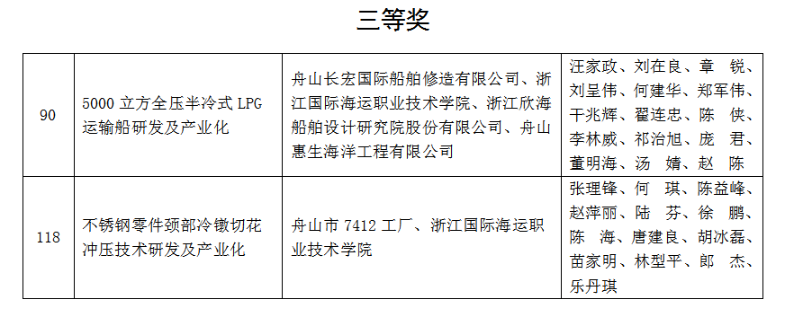 12月25日,中国商业联合会发布“2024年度中国商业联合会科学技术奖”评选结果公告,我校刘在良教授牵头与舟山长宏国际船舶修造有限公司等企业联合申报的《5000立方全压半冷式LPG运输船研发及产业化》,何琪教授牵头与舟山市7412工厂联合申报的《不锈钢零件颈部冷镦切花冲压技术研发及产业化》2个项目均获三等奖。