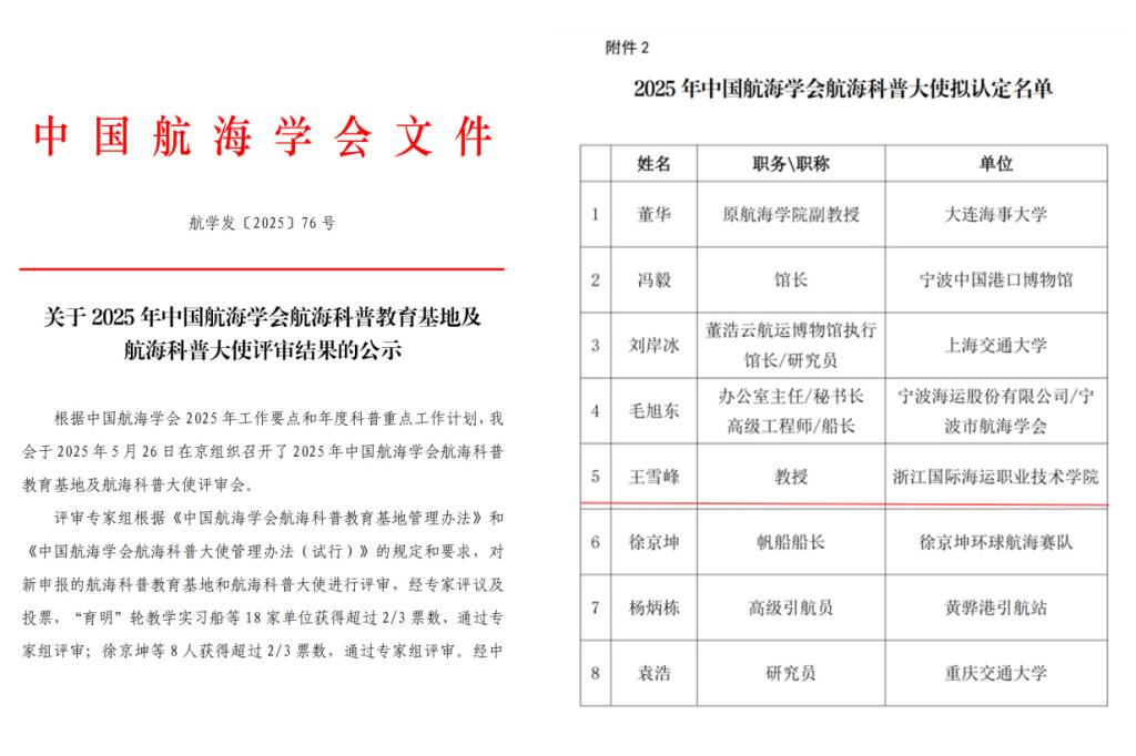 日前,中国航海学会在北京召开航海科普基地及航海科普大使评审会,我校航海工程学院王雪峰老师获评“航海科普大使”。