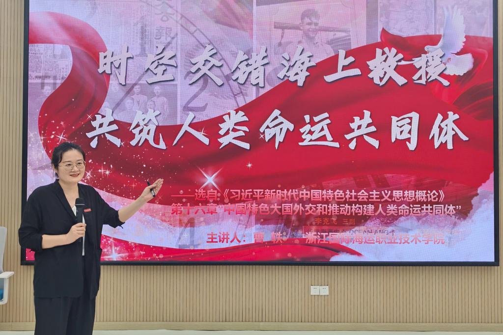 说课展示从南海实验小学的乐孜星老师开始,她为一年级小学生设计的《学会整理好方法》,借助AI动图,简洁易懂,为孩子们扣上了基本素养第一颗扣子;许慧颖老师的《少年有梦》从追梦入题,层层递进,鼓励初中的孩子们为祖国为人民树立远大理想;李林峰老师则从“小舢板”驶向“大航母的跨越式发展轨迹,证明了教育强国、技能报国的强国征程必须始终坚持和加强党的全面领导;陆甜甜老师借助模拟法庭辩论,融实践案例于培育法律素养的逻辑关系,为法护家园法润民心提供了温度;曹轶老师把里斯本丸号故事搬到了课堂上,引申出人类命运共同体的“五个世界”宏大视野;最后是浙江海洋大学龚鹰教授就发掘“红蓝绿”三色思政,围绕蚂蚁岛精神的传承与弘扬,作了丰富的成果展示。这6位来自不同学校的小学、初中、高中、本科与中职、高职等覆盖全学段的思政教师,共同围绕“真理的味道在千岛”,为如何上好新时代的思政课,推进大中小学思政课立德树人、守正创新,提交了海味浓郁的精彩答卷。