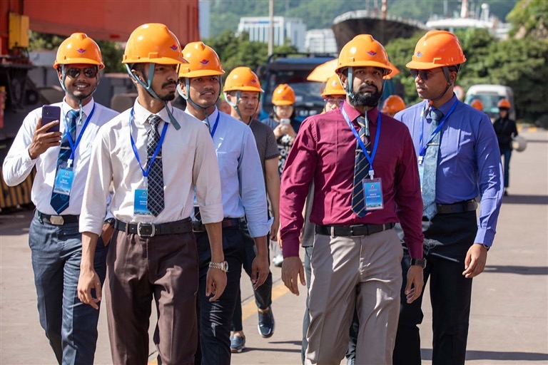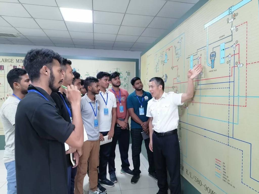 在为期一个月的培训中,学员们系统修习了船舶操纵、轮机管理等专业核心课程,并通过实操训练与虚拟仿真演练强化技能掌握。为促进中孟文化融合,培训同步开设基础中文课程,学员们展现出浓厚的学习热情与钻研精神。期间,学员们走进校企合作单位——普陀万邦船舶重工(舟山)有限公司,沉浸式体验舟山海洋文化:尝试渔民画创作、品尝海鲜小吃,感受非遗文化魅力;参观绿色修船车间,深入了解中国船舶工业的环保技术与创新成果。