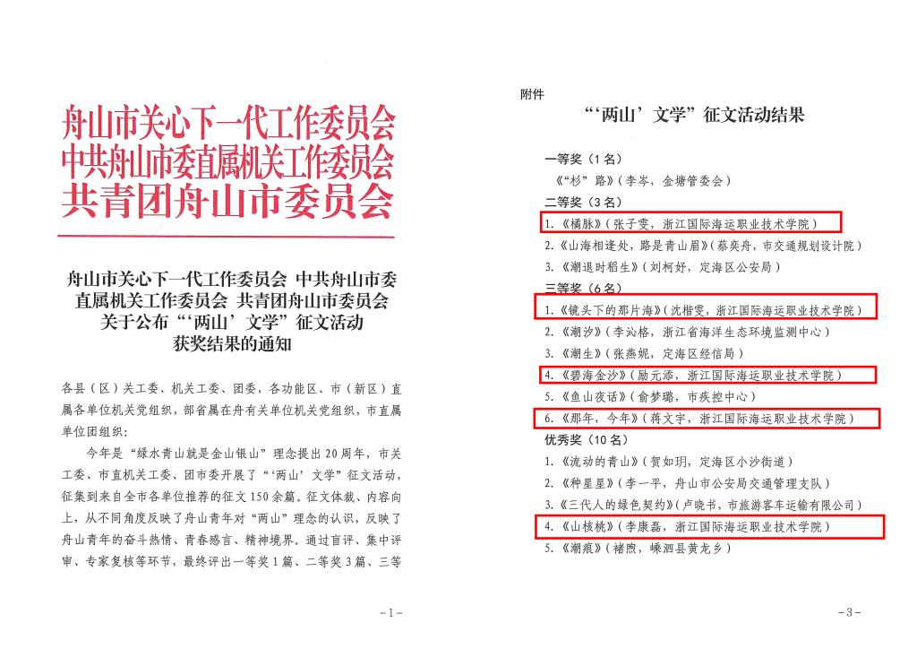 近日,由舟山市关工委、市直机关工委、共青团舟山市委联合举办的“两山”文学征文活动公布评选结果。我校在此次比赛中表现优异,共有5篇征文获奖,展现出新时代青年积极践行生态文明理念的昂扬风貌。