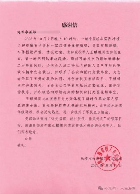 这一义举,被群众深深铭记。尚未完全康复的伤者专门寄来感谢信与锦旗,字里行间饱含感激之情。人民海军微信公众号也对此事进行专题报道,社会反响热烈。而这份危急时刻的挺身而出,绝非偶然,而是教育浸润与军营淬炼的必然结果。
