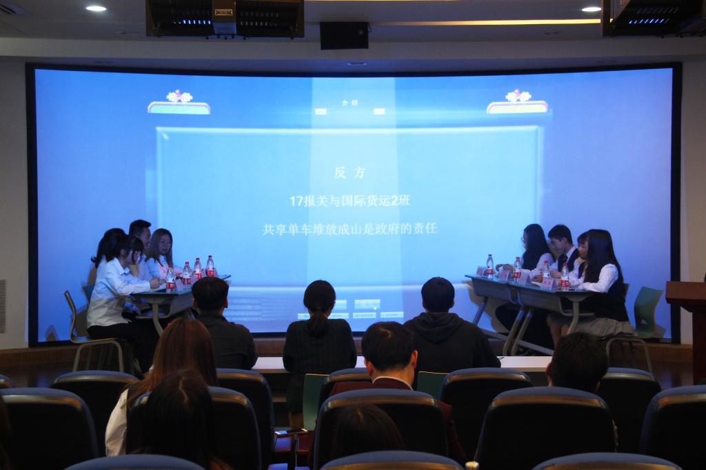 决赛分为两场,季军争夺赛在2017级数字媒体艺术设计1班辩论队与2017级报关与国际货运3班辩论队之间进行,双方围绕“发掘人才是否需要通过考试”同台激辩。冠军争夺赛围绕“共享单车损坏是政府或是企业的责任”辩题进行,正方2017级报关与国际货运1班辩论队分析了共享单车堆积如山的原因,阐释了造成该结果企业负主要责任;反方2017级报关与国际货运2班辩论队则认为政府在民生问题中起主导作用,共享单车管理不善是由于政府相关部门监管不力。双方辩手唇枪舌战、妙语连珠、逻辑缜密,赢得了场下观众阵阵喝彩。