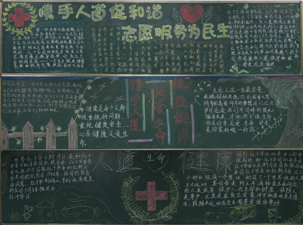在本次黑板报评比活动中,船舶工程学院各班同学利用晚自修时间,认真搜集资料,发挥各自特长,协调合作,共同完成。同学们的作品都较好呈现了对红十字会的理解与对健康的认识。