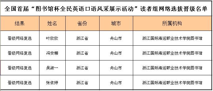 近日,全国首届“图书馆杯全民英语口语风采展示活动”读者组网络选拔晋级名单公布,我校2017级国际邮轮乘务管理1班的叶欣欣、2018级邮轮1班的冯安娜、船舶工程学院教师吴淑一、2018级应用英语1班的张依婷四人从159729名参赛选手中脱颖而出,成功晋级网络复赛。