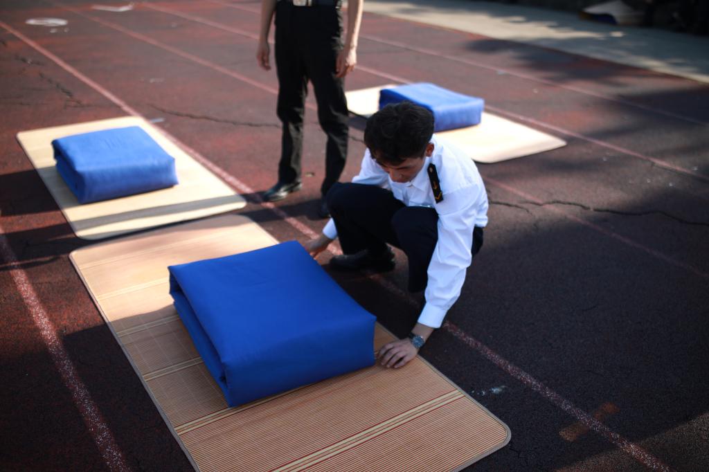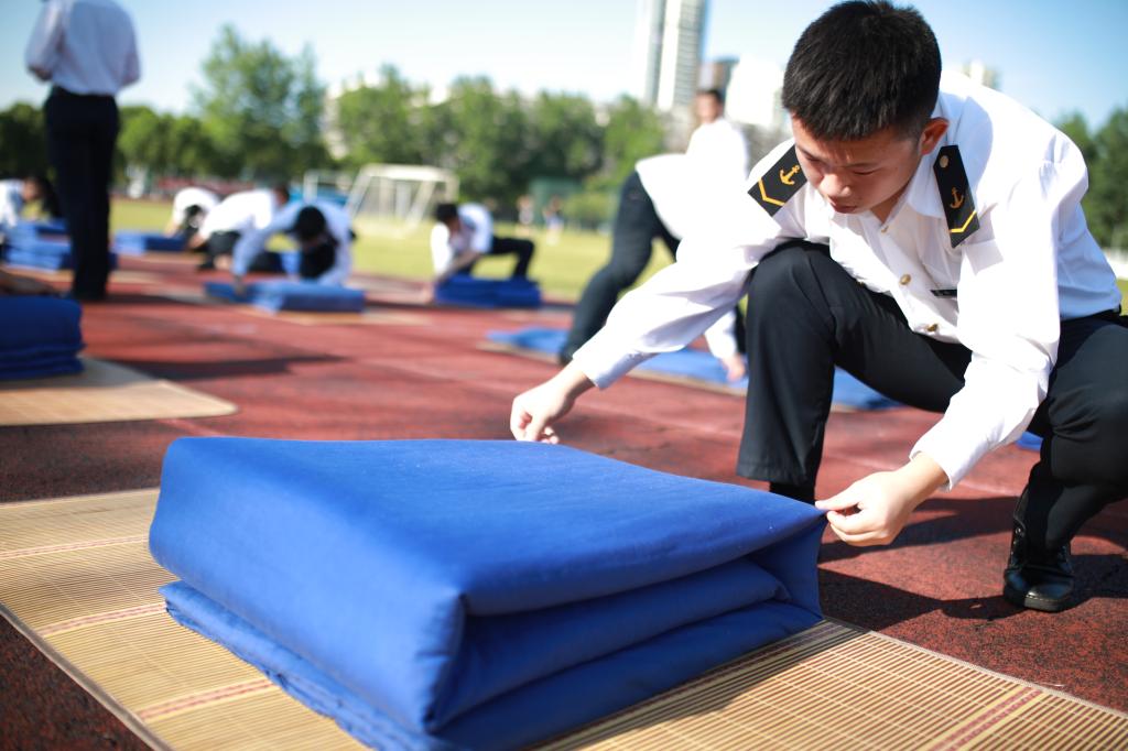 比赛共分为队列训练和叠被两个项目。比赛项目的设定贯穿航海工程学院准军事化日常生活始终,旨在强化学院准军事化管理成果、提高学院凝聚力、强化学生集体荣誉感。