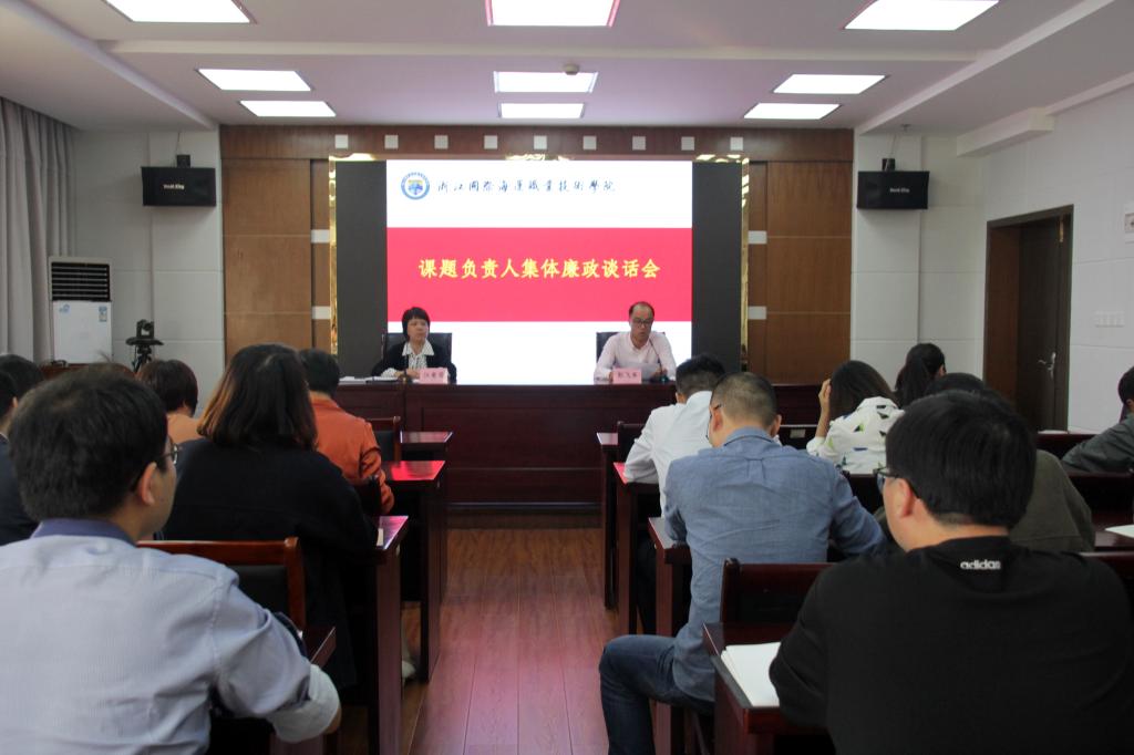 在“不忘初心、牢记使命”主题教育深入开展之际,为了进一步落实党中央、省市纪委以及校党委关于全面从严治党和加强党风廉政建设有关精神,强化课题项目实施过程中的风险隐患防范意识,确保学校科研课题项目规范、高效实施,10月24日下午,纪委办会同科研处组织召开了2019年课题负责人集体廉政谈话会。校党委委员、纪委书记江爱芬到会并讲话,全校各类课题负责人共30余人参加了本次廉政谈话会。会议由科研处副处长郭飞军主持。