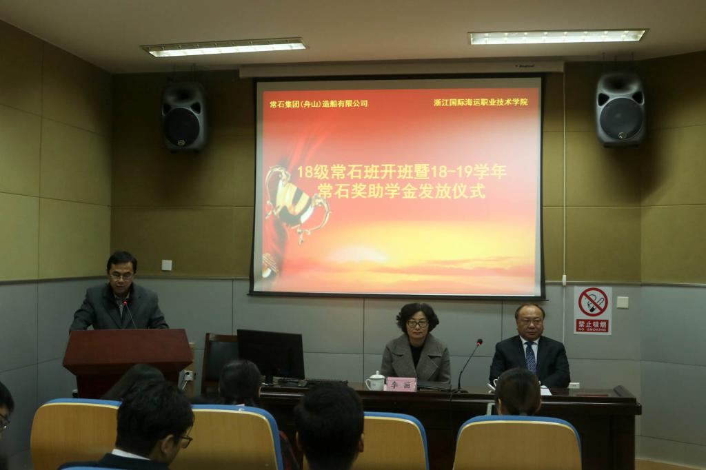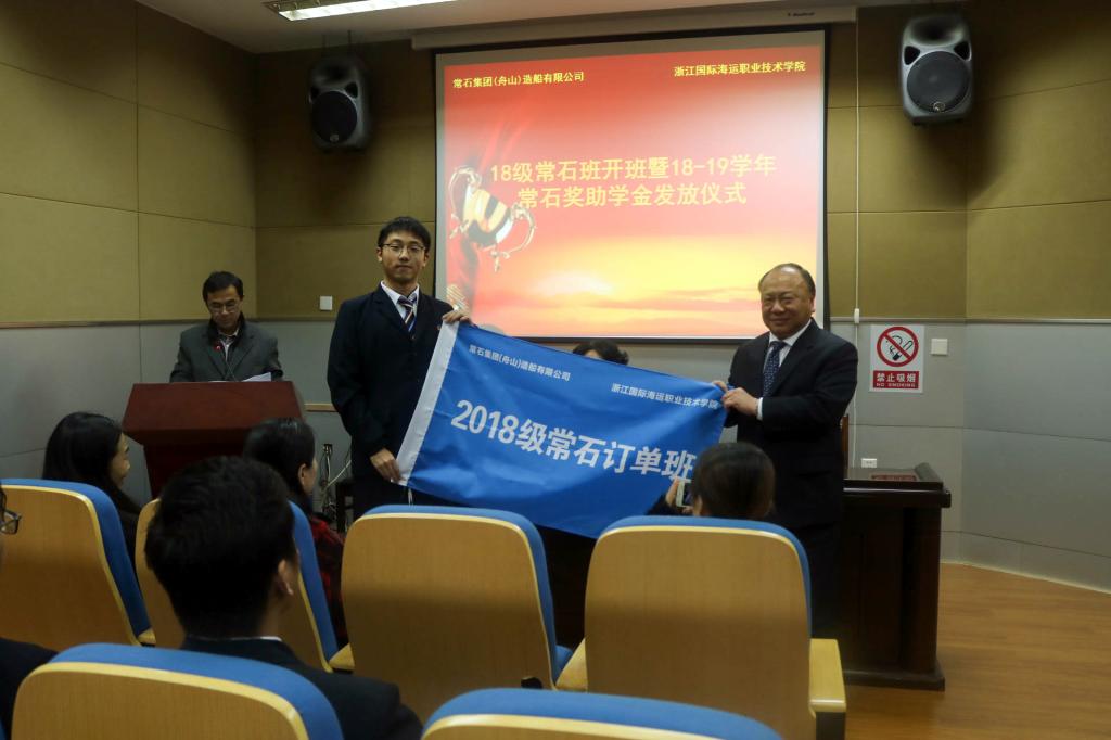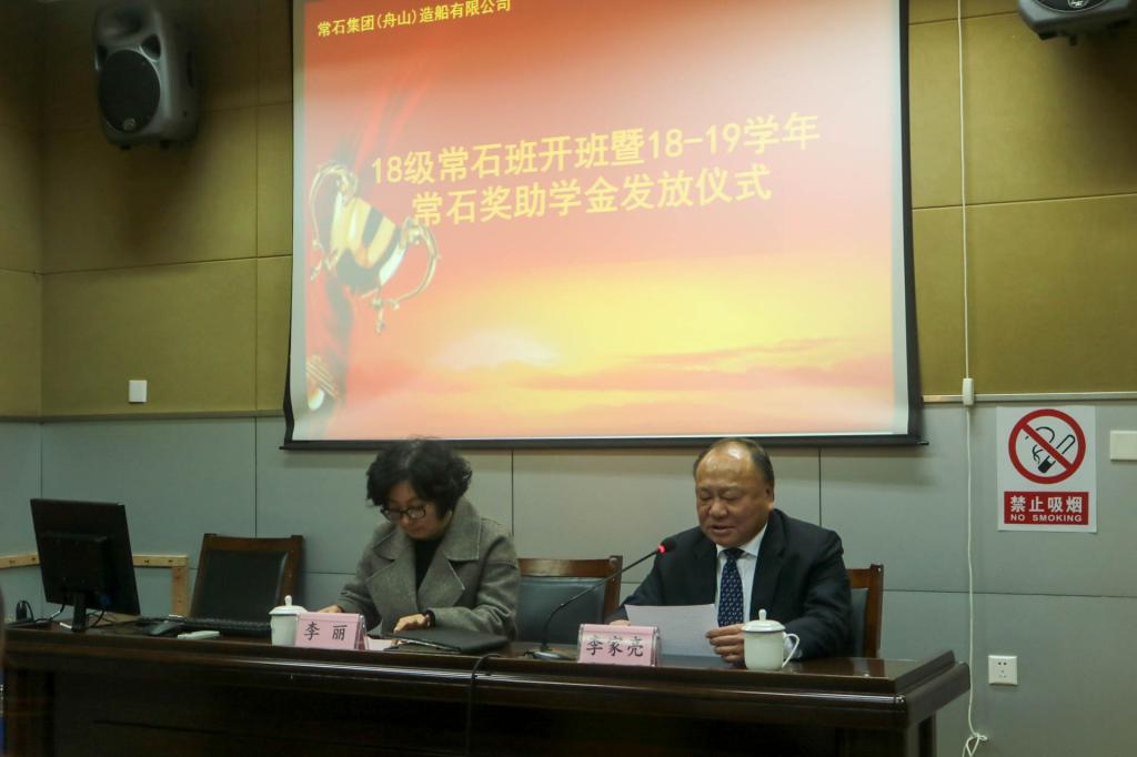 12月20日,2018级“常石”订单班开班暨2018-2019学年奖助学金发放仪式在船舶工程实训楼万邦厅举行。常石集团(舟山)造船有限公司副总经理李家亮、人事课长虞梦晓,学校副校长李丽、学生处处长芮明珠、教务处副处长郭娟,船舶工程学院行政班子、教师代表、辅导员以及2018级常石订单班全体学生参加了仪式。仪式由船舶工程学院院长李海波主持。