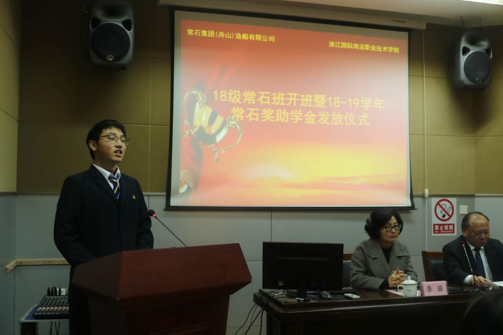 随后,李海波宣布2018-2019学年常石奖助学金获得者名单,并由李家亮先生亲自颁发奖助学金。2018级常石班学生李哲宁作为代表发言,他向常石集团对同学们的支持和帮助表示感谢。
