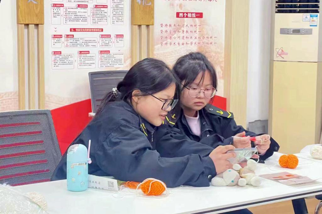 同学们拿起钩针、毛线,通过网络教程自学,一针一线地勾出一只只精美的柿子、花生,为“女神们”送去“好事发生”的美好祝福。同学们积极展示自己的手工成果,与身边的同学分享着自己的作品,现场欢声笑语不断。