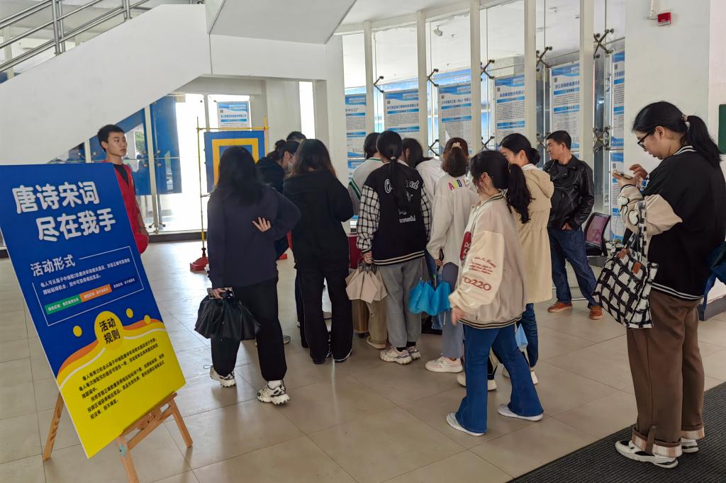 开幕式后,本届读者服务月开启了“学习党的二十大”猜谜活动和“唐诗宋词尽在我手”趣味活动。现场人头攒动,师生们或轻声品读,或悄悄讨论,或为同伴加油打气,其乐融融。
