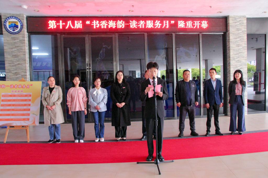春暖花开季,正是读书时。4月19日下午,我校第十八届“书香海韵 读者服务月”读书节开幕式在图书馆一楼大厅举行。校党委委员、副校长曹志斌出席开幕式并致辞,图书馆副馆长周勤主持开幕式。学校图书馆、宣传部、团委、文化体育部、各二级学院负责人及部分师生读者近300人出席了开幕仪式。