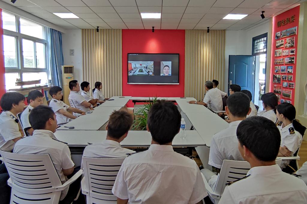 航海工程学院采用连线方式让在校学生与优秀学长李克飞线上交流。李克飞学长讲述了自己参与爱琴海救援的经过,从自身的航海经历,鼓励学弟学妹们一定要一鼓作气顺利考证。