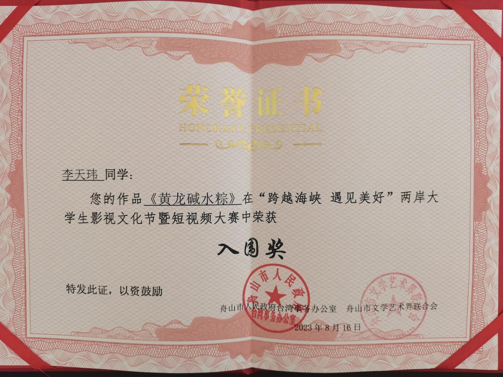 近日,“跨越海峡 遇见美好”两岸大学生短视频大赛颁奖仪式在我市举行,来自海峡两岸多所高校的大学生相聚一堂,分享创作心得,共话影视发展。由现代港口贸易学院李天玮同学创作的作品《黄龙碱水粽》荣获入围奖。
