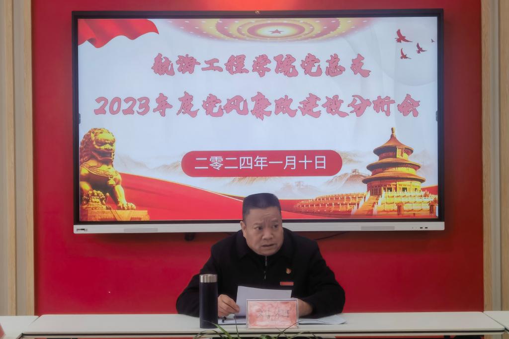 1月10日下午,航海工程学院党总支在海慧楼309会议室召开了2023年度党风廉政建设分析会。校党委委员、工会主席刘相,校考核组成员郑忠义、戴智明出席会议,学院班子成员、专业团队长、党支部书记参加会议,会议由学院党总支书记李刚主持。