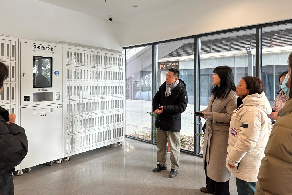 定海区图书馆馆长黄海敏对我校图书馆一行的来访表示了热烈欢迎,陪同参观了各楼层区域,详细介绍了区图书馆多元化的空间布局、完善的功能设置和智能化设施设备的应用等亮点。
